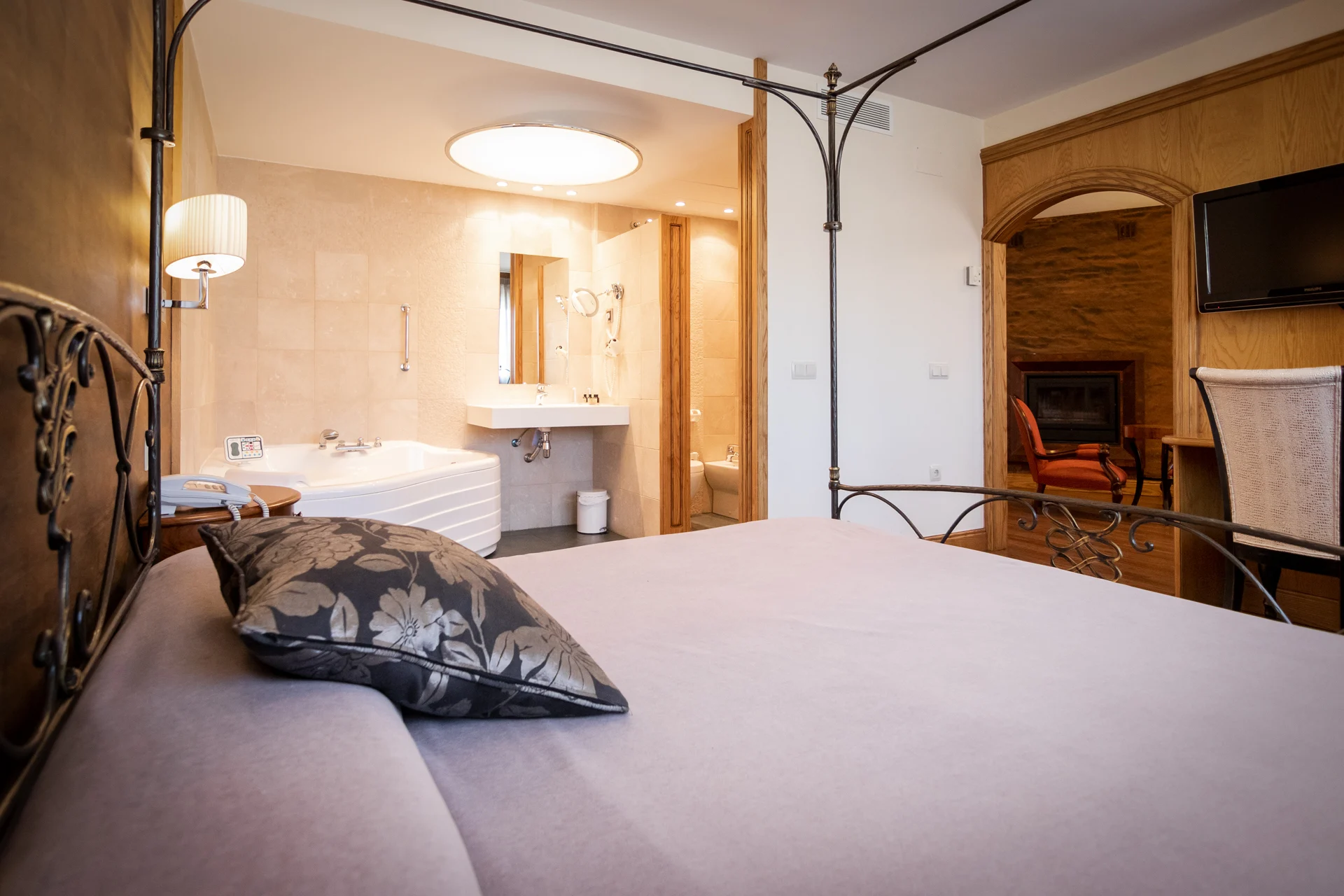 Nuestra suite no defrauda, un espacio para los más exigentes. Relájate en su jacuzzi, prepara tu ruta rural sentado en el sofá de su salón junto a su chimenea. Encontrarás un espacio para cada momento y necesidad. Un refugio con verdadero encanto pensado para tu disfrute y comodidad.